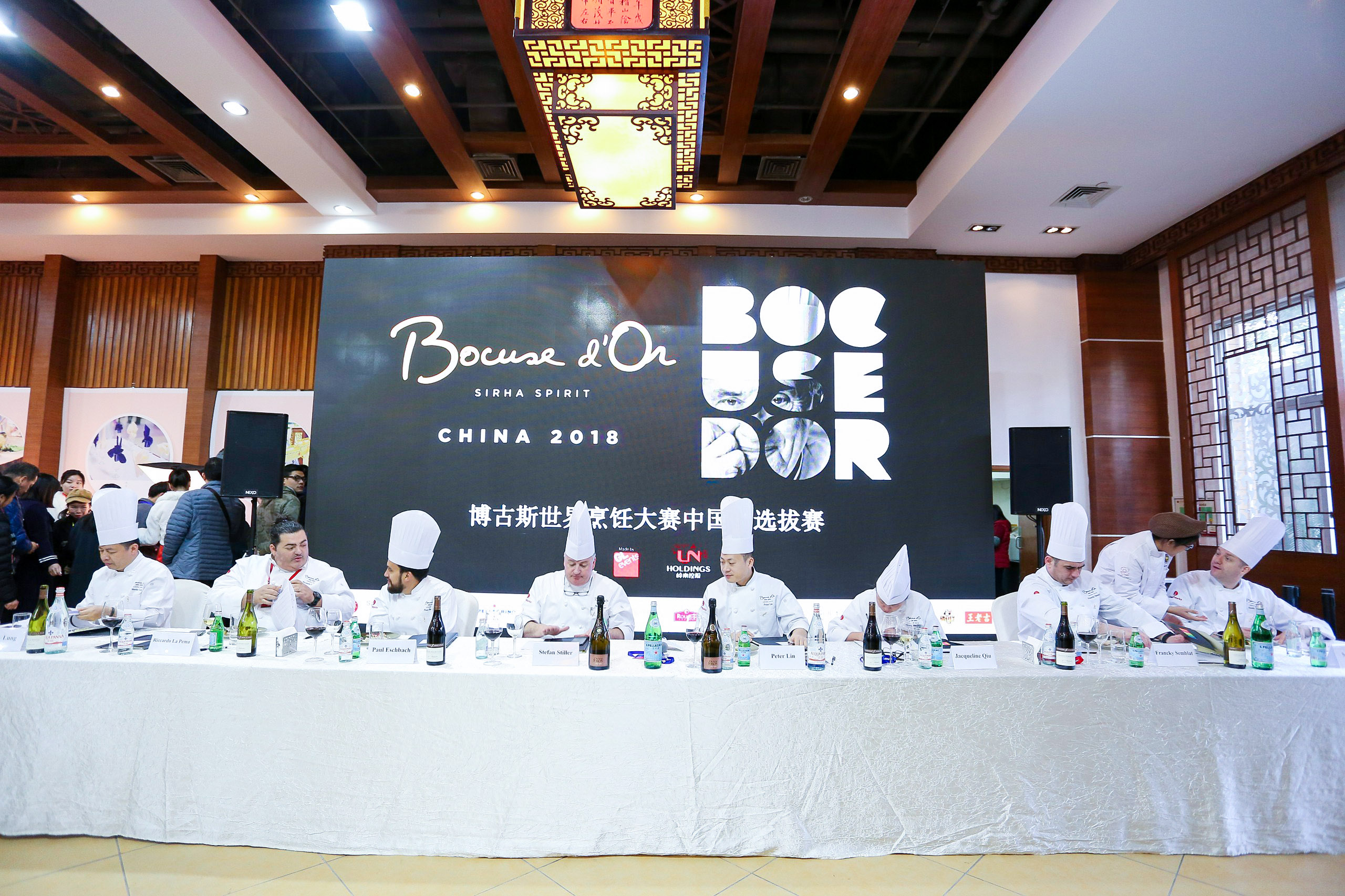 2018博古斯中國賽評委團:博古斯中國學會主席/上海米其林一星餐廳泰安門創始人Stefan Stiller;著名女行政主廚邱瓊;2014及2016博古斯中國賽冠軍林韋龍;Jean Georges餐廳大中華地區行政總廚Paul Eschbach;L'Atelier de Jo?l Robuchon中國區行政主廚Francky Semblat;上海8? Otto e Mezzo主廚Riccardo La Perna;The Commune Social創始人Scott Melvin;廣州南沙花園酒店總經理/中國烹飪協會名廚專業委員會委員龍偉彥(Hardy Lung)。